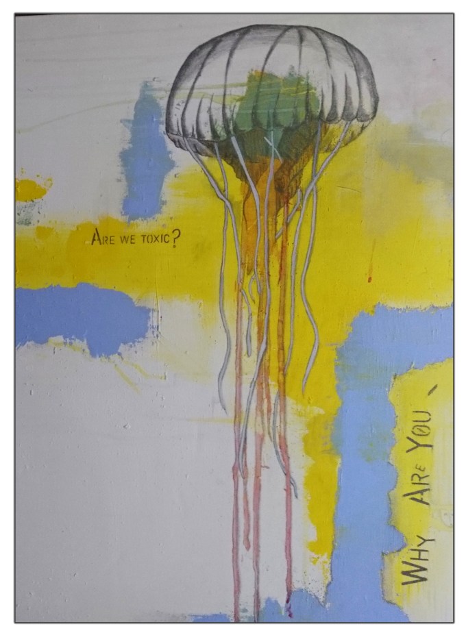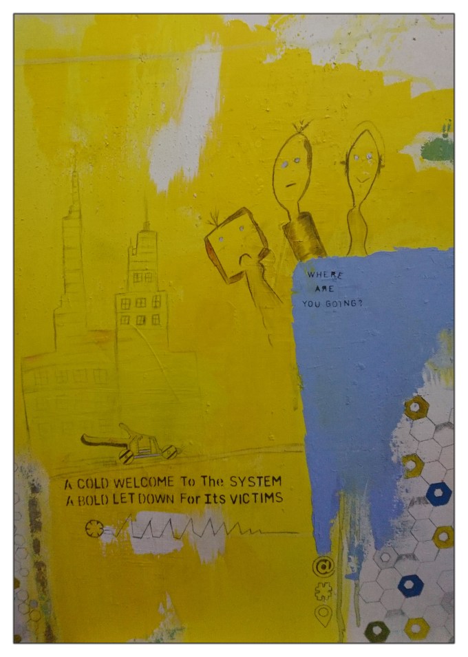 Fine sawdust was sparsely used to create a little texture along with some wood chippings and shredded pieces of paper. I felt it was most suitable for the subtle yet rough and rustic appeal I imagined it to be. Washed with brilliant white I applied primarily bold lemon yellow and powder blue acrylic paint by brush and palette knife also daubing & dripping silver and olive acrylic paint here and there to create a backdrop for the literary and doodle-ish sketches. Many stencilled writings and hand-written observations are depicted in the form of a query or statement enlightening the fact that, its not always as it seems.